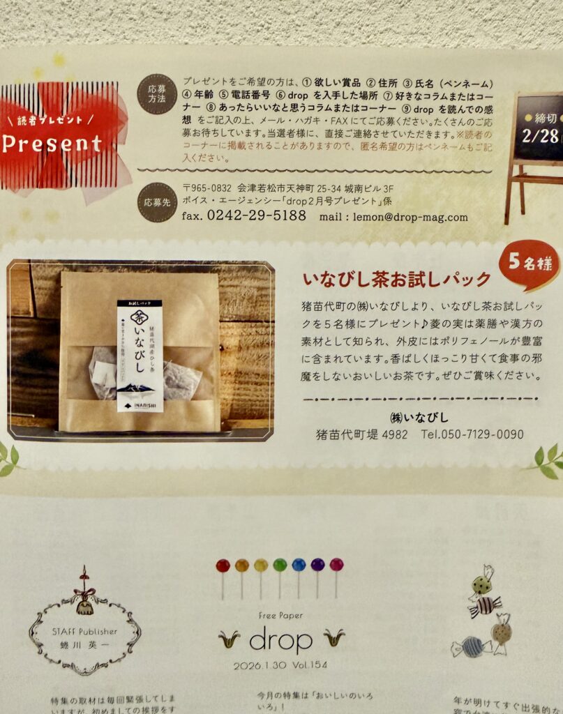 このたび、会津若松市で配布されている人気フリーペーパー 「drop」 に、株式会社いなびしの「猪苗代湖産ひし茶」が掲載されました。