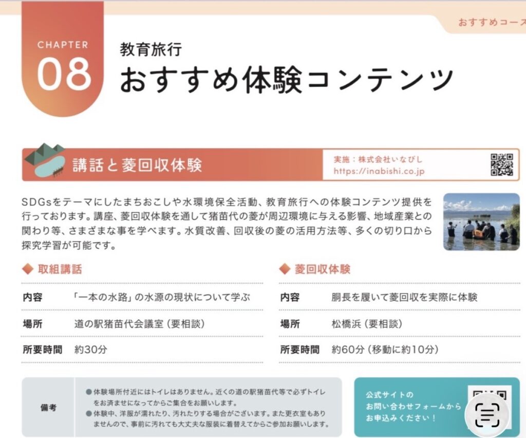 この菱の実を実際に湖で採取する「菱の実収穫体験」 が、このたび日本遺産「一本の水路」の教育旅行向けガイドブックに掲載されました。